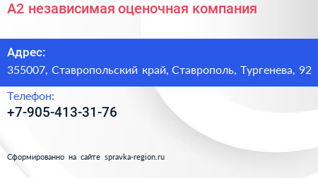 А2, независимая оценочная компания по адресу 355007, Ставропольский край, Ставрополь, Тургенева, 92 в дальнейшем Организация, размещена в следующих категориях: