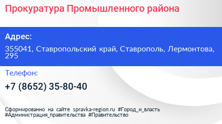 Прокуратура Промышленного района по адресу 355041, Ставропольский край, Ставрополь, Лермонтова, 295 в дальнейшем Организация, размещена в следующих категориях: