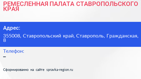 РЕМЕСЛЕННАЯ ПАЛАТА СТАВРОПОЛЬСКОГО КРАЯ по адресу 355008, Ставропольский край, Ставрополь, Гражданская, 8 в дальнейшем Организация, размещена в следующих категориях:
