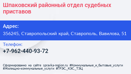 Шпаковский районный отдел судебных приставов по адресу 356245, Ставропольский край, Ставрополь, Вавилова, 51 в дальнейшем Организация, размещена в следующих категориях: