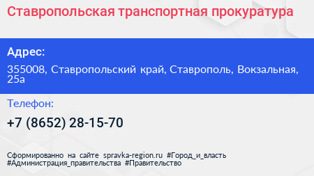 Ставропольская транспортная прокуратура по адресу 355008, Ставропольский край, Ставрополь, Вокзальная, 25а в дальнейшем Организация, размещена в следующих категориях:
