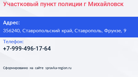 Участковый пункт полиции, г. Михайловск по адресу 356240, Ставропольский край, Ставрополь, Фрунзе, 9 в дальнейшем Организация, размещена в следующих категориях: