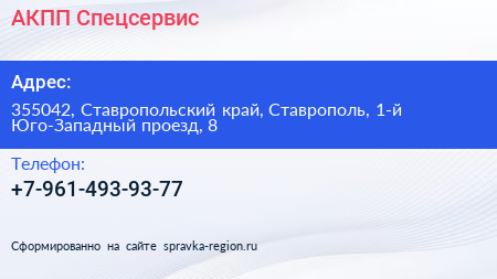 АКПП-Спецсервис по адресу 355042, Ставропольский край, Ставрополь, 1-й Юго-Западный проезд, 8 в дальнейшем Организация, размещена в следующих категориях:
