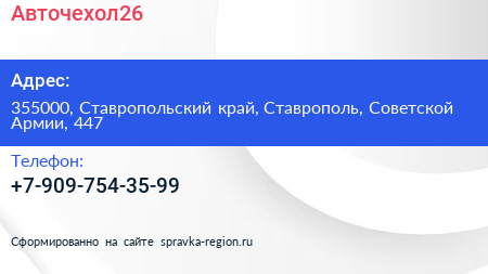 Авточехол26 по адресу 355000, Ставропольский край, Ставрополь, Советской Армии, 447 в дальнейшем Организация, размещена в следующих категориях: