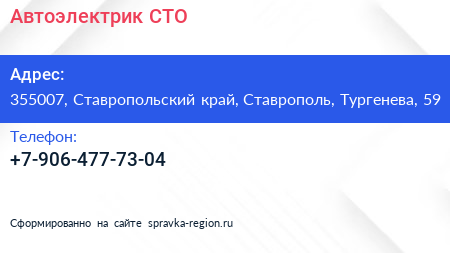 Автоэлектрик, СТО по адресу 355007, Ставропольский край, Ставрополь, Тургенева, 59 в дальнейшем Организация, размещена в следующих категориях: