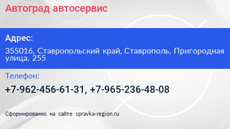 Автоград, автосервис по адресу 355016, Ставропольский край, Ставрополь, Пригородная улица, 255 в дальнейшем Организация, размещена в следующих категориях:
