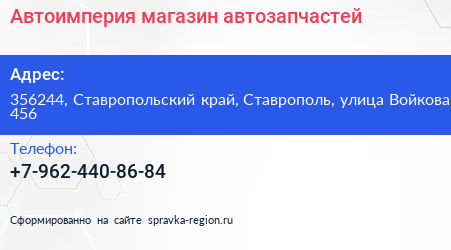 Автоимперия, магазин автозапчастей по адресу 356244, Ставропольский край, Ставрополь, улица Войкова, 456 в дальнейшем Организация, размещена в следующих категориях: