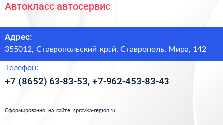 Автокласс, автосервис по адресу 355012, Ставропольский край, Ставрополь, Мира, 142 в дальнейшем Организация, размещена в следующих категориях: