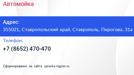 Автомойка по адресу 355021, Ставропольский край, Ставрополь, Пирогова, 31а в дальнейшем Организация, размещена в следующих категориях: