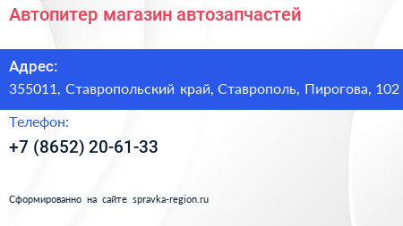 Автопитер, магазин автозапчастей по адресу 355011, Ставропольский край, Ставрополь, Пирогова, 102 в дальнейшем Организация, размещена в следующих категориях: