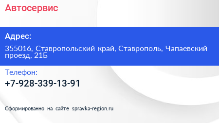Автосервис по адресу 355016, Ставропольский край, Ставрополь, Чапаевский проезд, 21Б в дальнейшем Организация, размещена в следующих категориях: