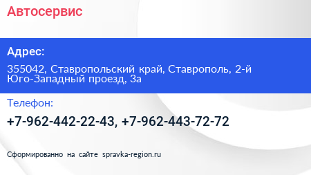 Автосервис по адресу 355042, Ставропольский край, Ставрополь, 2-й Юго-Западный проезд, 3а в дальнейшем Организация, размещена в следующих категориях: