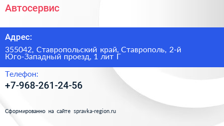 Автосервис по адресу 355042, Ставропольский край, Ставрополь, 2-й Юго-Западный проезд, 1 лит Г в дальнейшем Организация, размещена в следующих категориях: