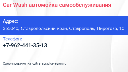 Car Wash, автомойка самообслуживания по адресу 355040, Ставропольский край, Ставрополь, Пирогова, 10 в дальнейшем Организация, размещена в следующих категориях: