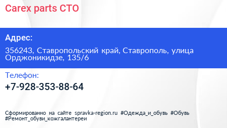 Carex parts, СТО по адресу 356243, Ставропольский край, Ставрополь, улица Орджоникидзе, 135/6 в дальнейшем Организация, размещена в следующих категориях: