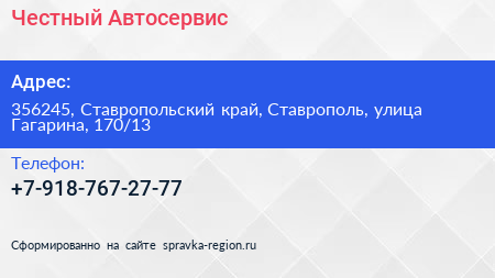 Честный Автосервис по адресу 356245, Ставропольский край, Ставрополь, улица Гагарина, 170/13 в дальнейшем Организация, размещена в следующих категориях: