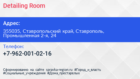 Detailing Room по адресу 355035, Ставропольский край, Ставрополь, Промышленная 2-я, 24 в дальнейшем Организация, размещена в следующих категориях: