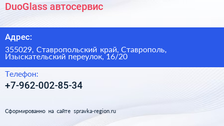 DuoGlass, автосервис по адресу 355029, Ставропольский край, Ставрополь, Изыскательский переулок, 16/20 в дальнейшем Организация, размещена в следующих категориях: