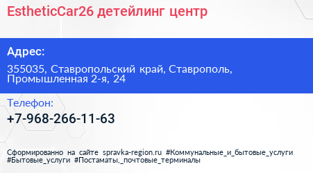 EstheticCar26, детейлинг-центр по адресу 355035, Ставропольский край, Ставрополь, Промышленная 2-я, 24 в дальнейшем Организация, размещена в следующих категориях:
