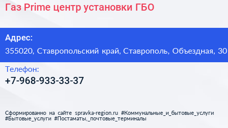 Газ Prime, центр установки ГБО по адресу 355020, Ставропольский край, Ставрополь, Объездная, 30 в дальнейшем Организация, размещена в следующих категориях: