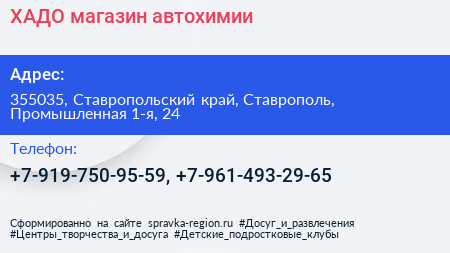 ХАДО, магазин автохимии по адресу 355035, Ставропольский край, Ставрополь, Промышленная 1-я, 24 в дальнейшем Организация, размещена в следующих категориях: