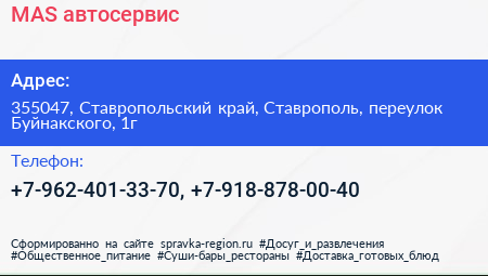 MAS, автосервис по адресу 355047, Ставропольский край, Ставрополь, переулок Буйнакского, 1г в дальнейшем Организация, размещена в следующих категориях: