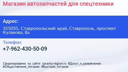 Магазин автозапчастей для спецтехники по адресу 355035, Ставропольский край, Ставрополь, проспект Кулакова, 8а в дальнейшем Организация, размещена в следующих категориях: