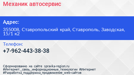 Механик, автосервис по адресу 355008, Ставропольский край, Ставрополь, Заводская, 15/1 к2 в дальнейшем Организация, размещена в следующих категориях: