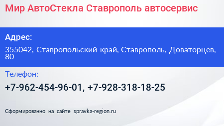 Мир АвтоСтекла-Ставрополь, автосервис по адресу 355042, Ставропольский край, Ставрополь, Доваторцев, 80 в дальнейшем Организация, размещена в следующих категориях: