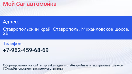 Мой Car, автомойка по адресу Ставропольский край, Ставрополь, Михайловское шоссе, 2Б в дальнейшем Организация, размещена в следующих категориях: