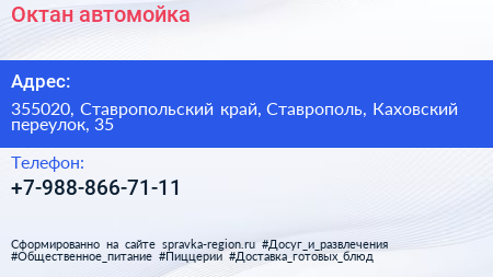 Октан, автомойка по адресу 355020, Ставропольский край, Ставрополь, Каховский переулок, 35 в дальнейшем Организация, размещена в следующих категориях: