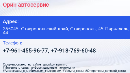 Орин, автосервис по адресу 355045, Ставропольский край, Ставрополь, 45 Параллель, 44 в дальнейшем Организация, размещена в следующих категориях: