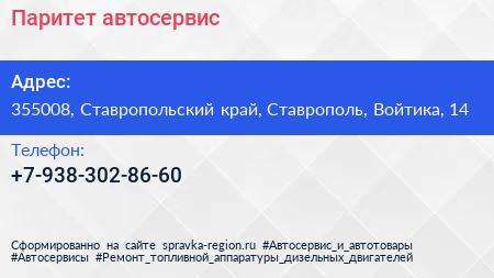 Паритет, автосервис по адресу 355008, Ставропольский край, Ставрополь, Войтика, 14 в дальнейшем Организация, размещена в следующих категориях: