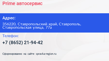 Prime, автосервис по адресу 356220, Ставропольский край, Ставрополь, Ставропольская улица, 77а в дальнейшем Организация, размещена в следующих категориях: