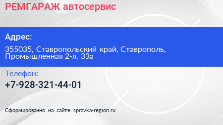 РЕМГАРАЖ, автосервис по адресу 355035, Ставропольский край, Ставрополь, Промышленная 2-я, 33а в дальнейшем Организация, размещена в следующих категориях: