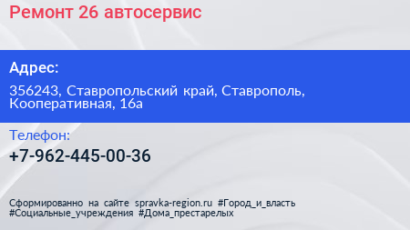 Ремонт-26, автосервис по адресу 356243, Ставропольский край, Ставрополь, Кооперативная, 16а в дальнейшем Организация, размещена в следующих категориях:
