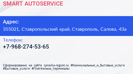 SMART AUTOSERVICE по адресу 355021, Ставропольский край, Ставрополь, Салова, 43а в дальнейшем Организация, размещена в следующих категориях:
