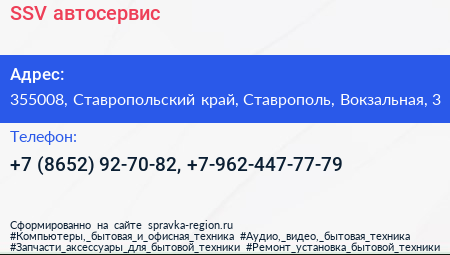 SSV, автосервис по адресу 355008, Ставропольский край, Ставрополь, Вокзальная, 3 в дальнейшем Организация, размещена в следующих категориях: