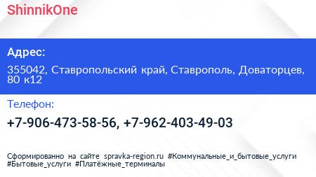 ShinnikOne по адресу 355042, Ставропольский край, Ставрополь, Доваторцев, 80 к12 в дальнейшем Организация, размещена в следующих категориях: