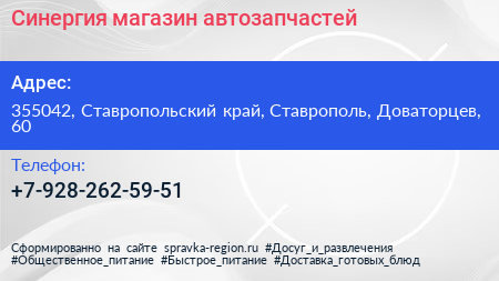 Синергия, магазин автозапчастей по адресу 355042, Ставропольский край, Ставрополь, Доваторцев, 60 в дальнейшем Организация, размещена в следующих категориях: