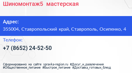 Шиномонтаж5+, мастерская по адресу 355004, Ставропольский край, Ставрополь, Осипенко, 4 в дальнейшем Организация, размещена в следующих категориях: