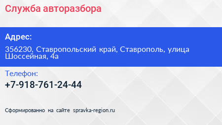 Служба авторазбора по адресу 356230, Ставропольский край, Ставрополь, улица Шоссейная, 4а в дальнейшем Организация, размещена в следующих категориях: