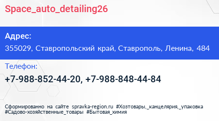 Space_auto_detailing26 по адресу 355029, Ставропольский край, Ставрополь, Ленина, 484 в дальнейшем Организация, размещена в следующих категориях: