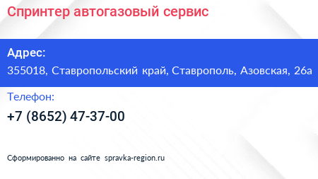 Спринтер, автогазовый сервис по адресу 355018, Ставропольский край, Ставрополь, Азовская, 26а в дальнейшем Организация, размещена в следующих категориях: