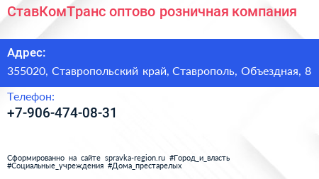 СтавКомТранс, оптово-розничная компания по адресу 355020, Ставропольский край, Ставрополь, Объездная, 8 в дальнейшем Организация, размещена в следующих категориях: