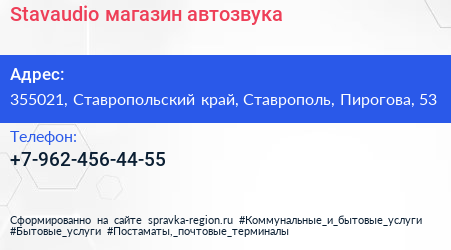 Stavaudio, магазин автозвука по адресу 355021, Ставропольский край, Ставрополь, Пирогова, 53 в дальнейшем Организация, размещена в следующих категориях: