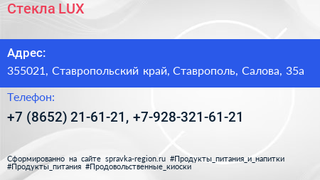 Стекла LUX по адресу 355021, Ставропольский край, Ставрополь, Салова, 35а в дальнейшем Организация, размещена в следующих категориях: