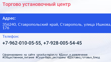 Торгово-установочный центр по адресу 356240, Ставропольский край, Ставрополь, улица Ишкова, 176 в дальнейшем Организация, размещена в следующих категориях: