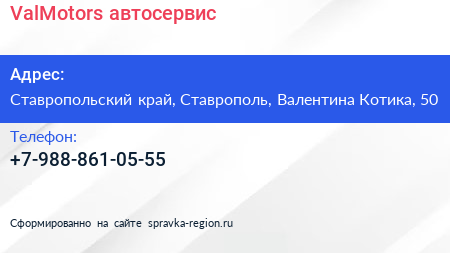 ValMotors, автосервис по адресу Ставропольский край, Ставрополь, Валентина Котика, 50 в дальнейшем Организация, размещена в следующих категориях: