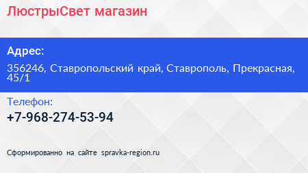 ЛюстрыСвет, магазин по адресу 356246, Ставропольский край, Ставрополь, Прекрасная, 45/1 в дальнейшем Организация, размещена в следующих категориях: